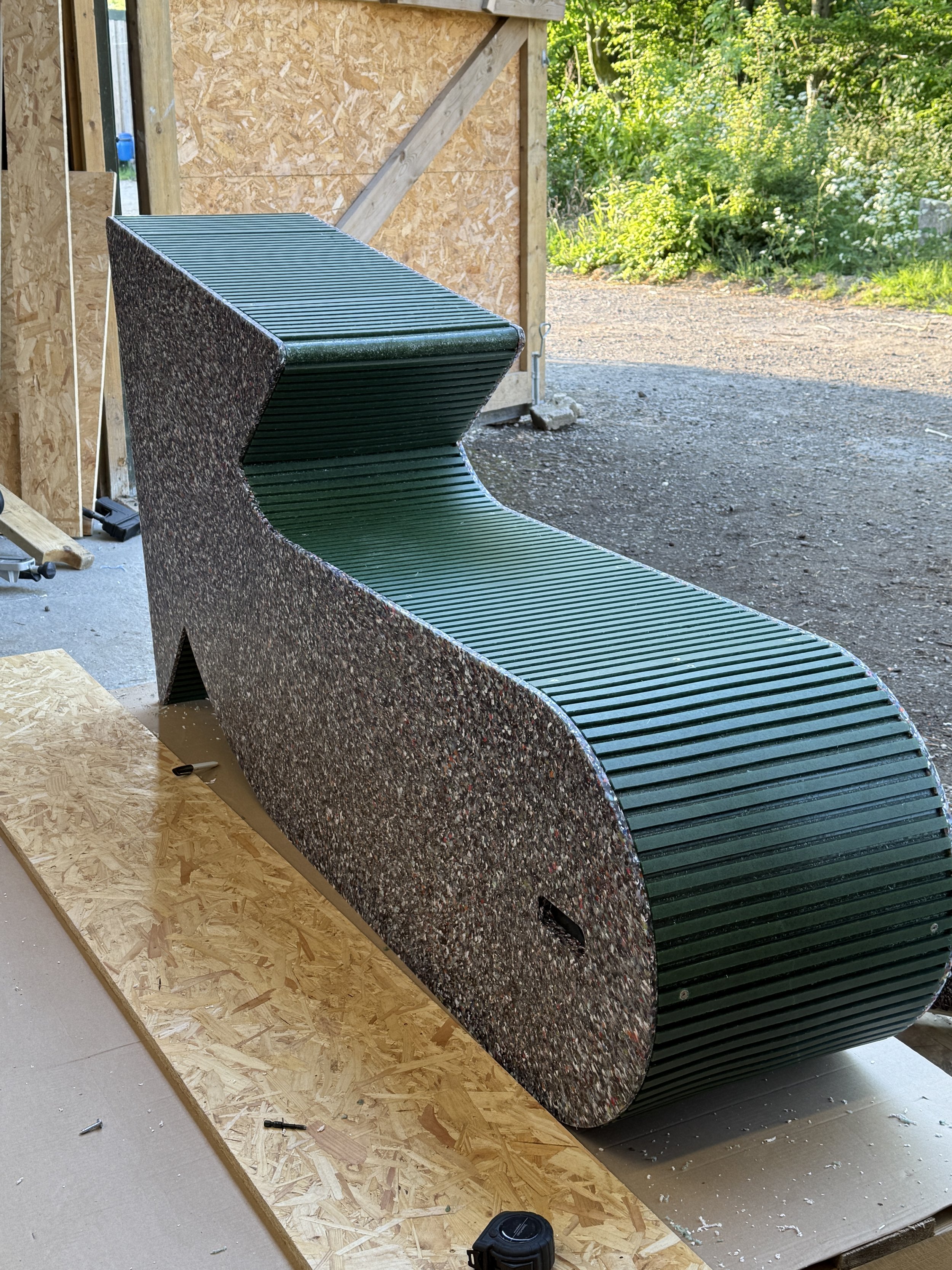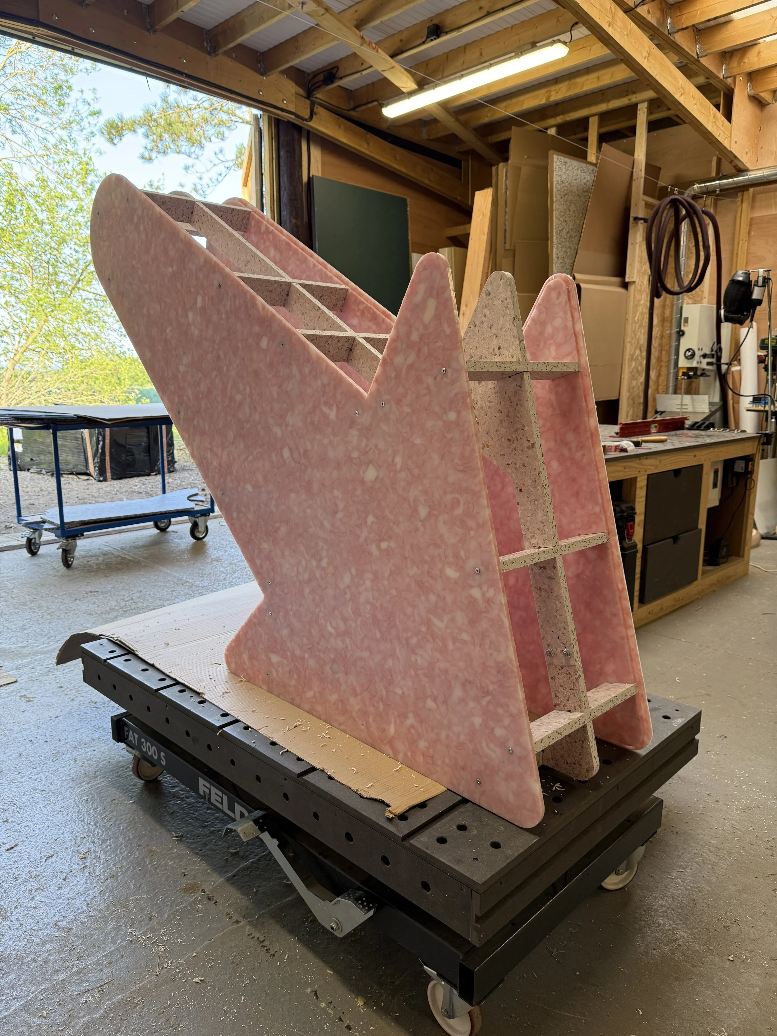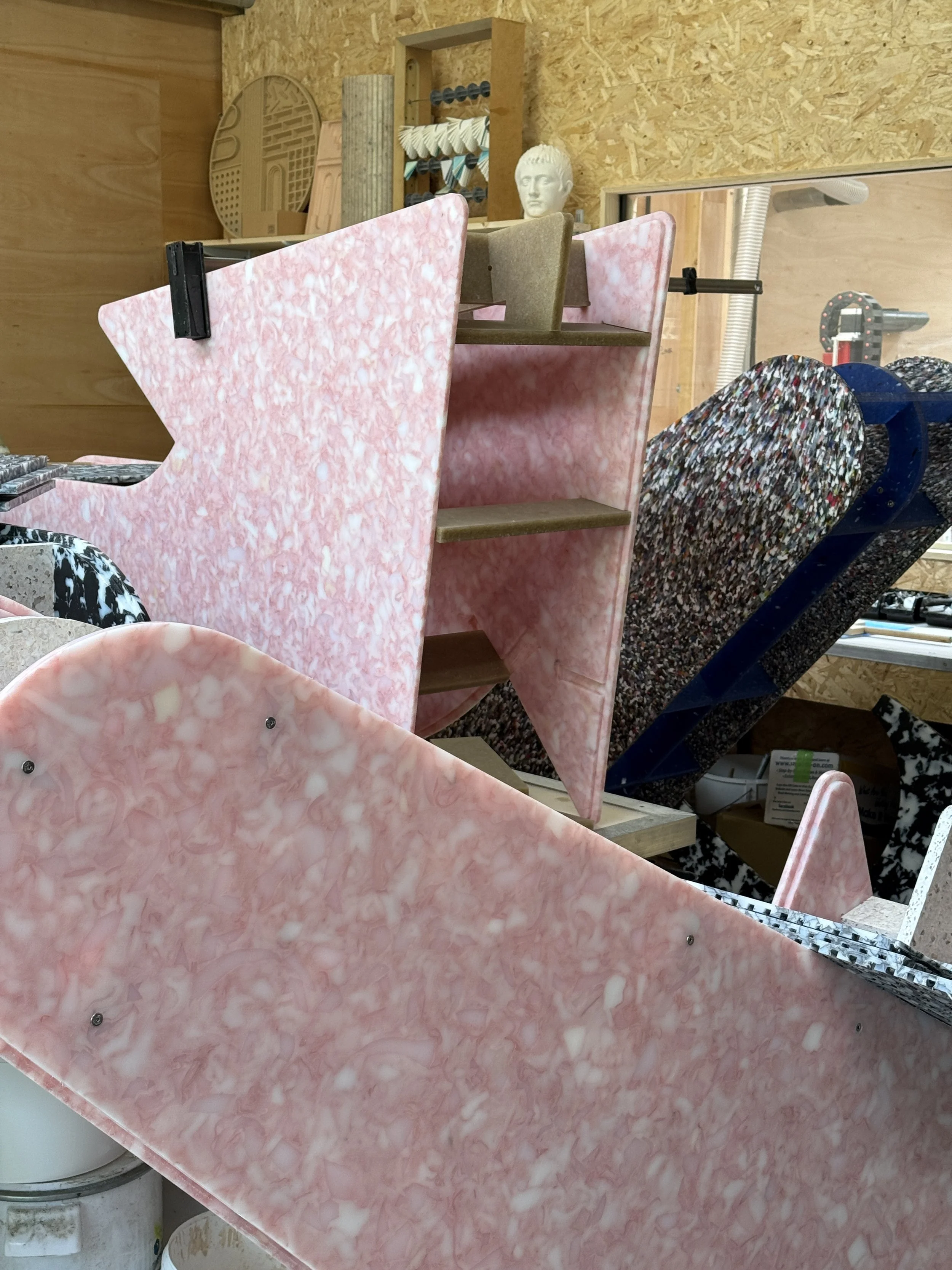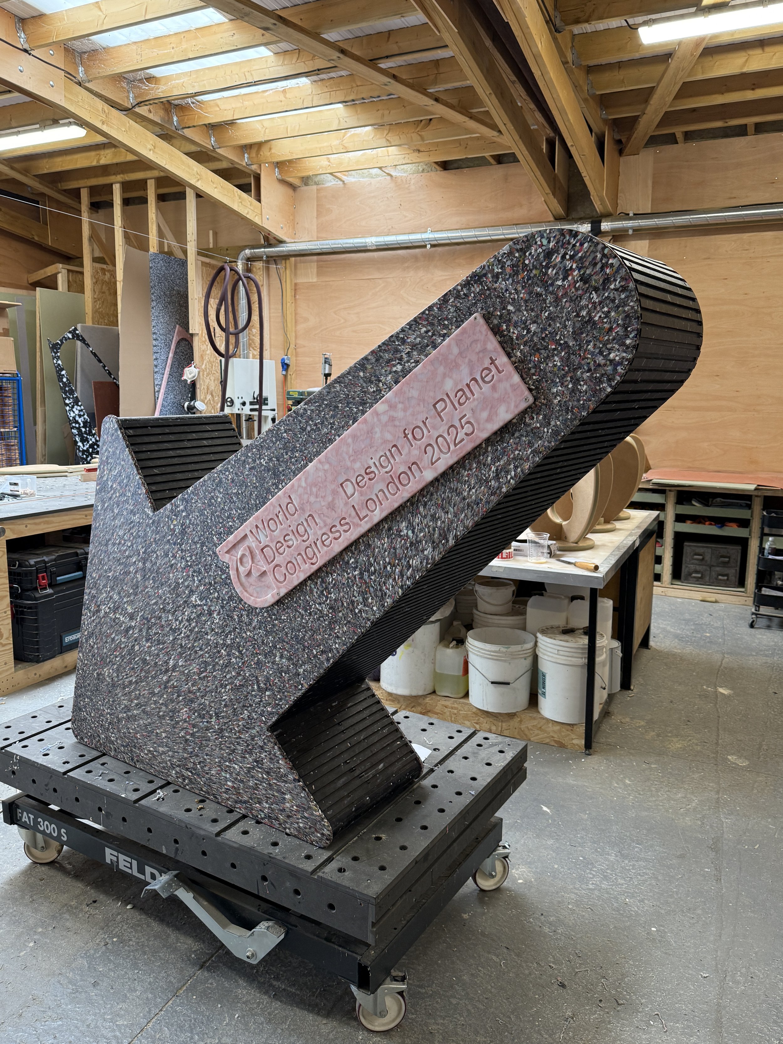 The brief was to create a series of 10 large scale reusable plastic arrows, which could be used as both way-finding and public furniture. Principall designed for Clerkenwell Design week 2025, the arrows are designed with reusable and removable signage elements so they can be used across London Design events. All arrows were designed to be made entirely with recycled plastic, including the internal structure made from rejected 20mm panels.